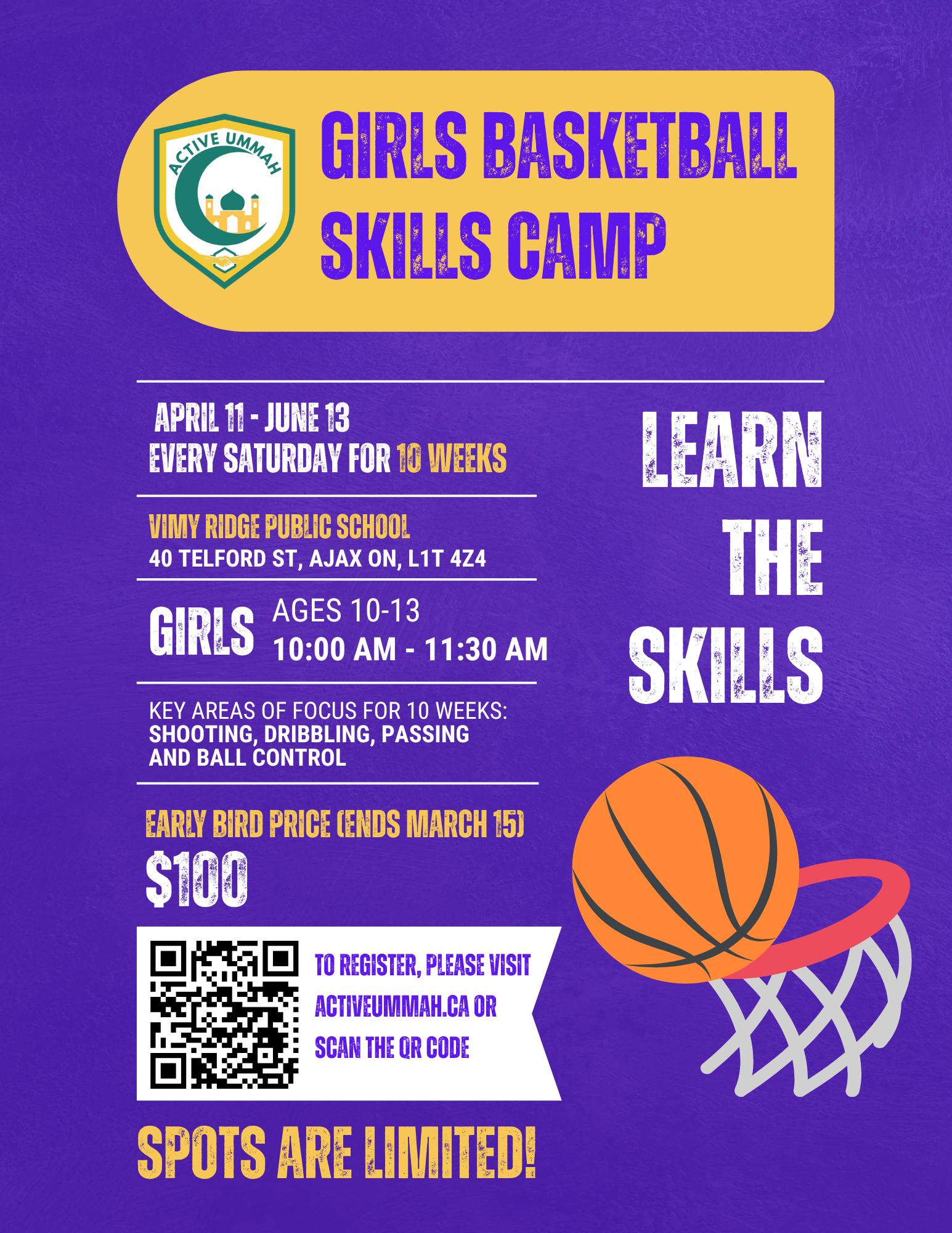 This 10 week program will go through fundamental skills to play organized basketball and improve the fundamentals required: shooting, passing, dribbling, rebounding, ball control, and playing as a collective team.